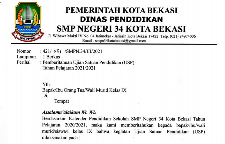 Diinformasikan kepada seluruh Wali Murid dan peserta didik Kelas 9, berdasarkan kalender pendidikan sekolah SMPN 34 Kota Bekasi tahun pelajaran 2020/2021, maka kami memberitahukan bahwa kegiatan Ujian Satuan Pendidikan (USP) dilaksanakan pada :